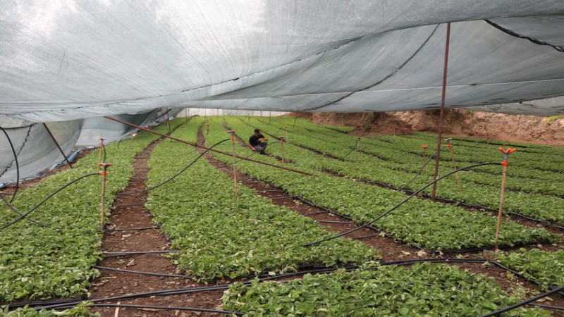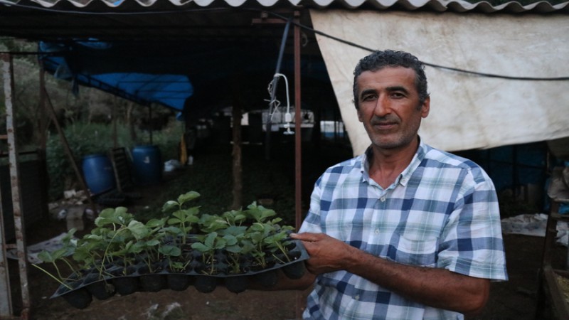Hatay'ın sınır ilçesi Yayladağı'nda, maliyetleri azaltmak için başladıkları çilek fidesi üretimini yaygınlaştıran çiftçiler, bu yıl kendilerinin yetiştirdiği 2,